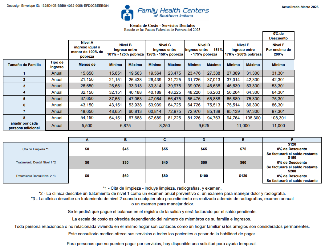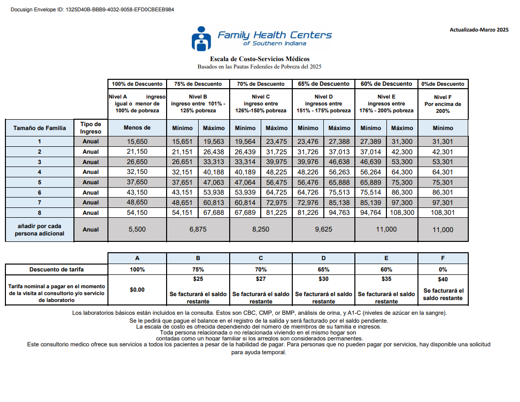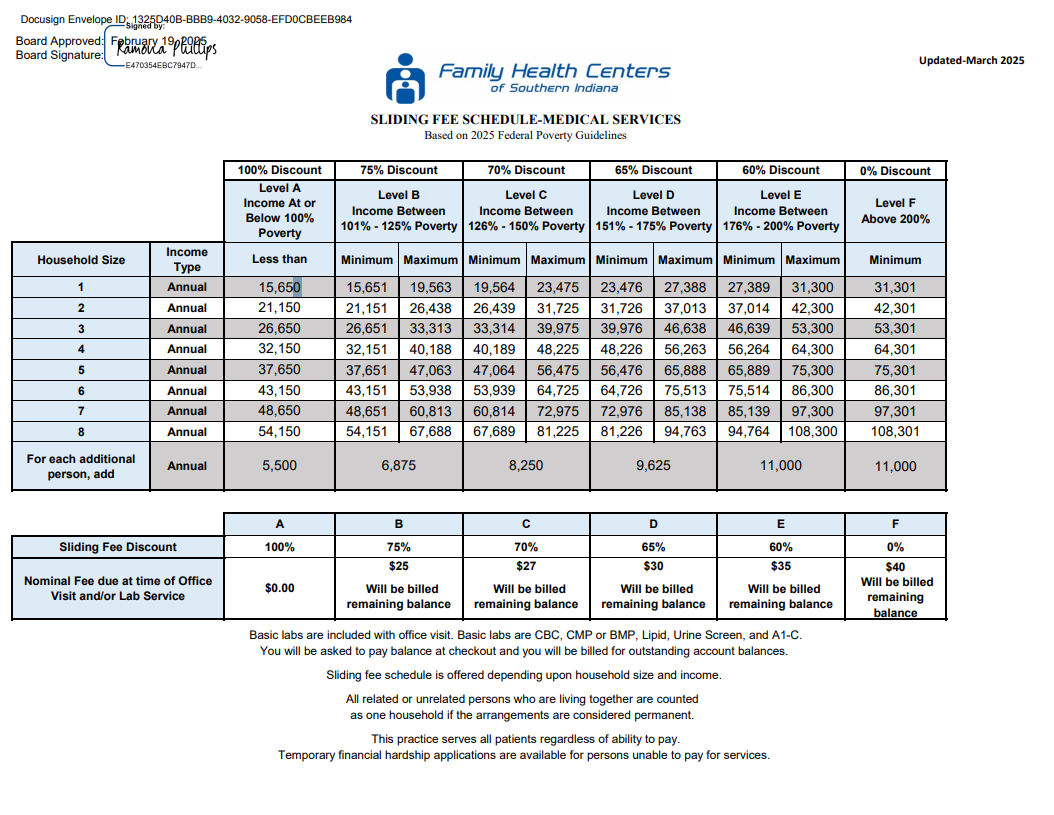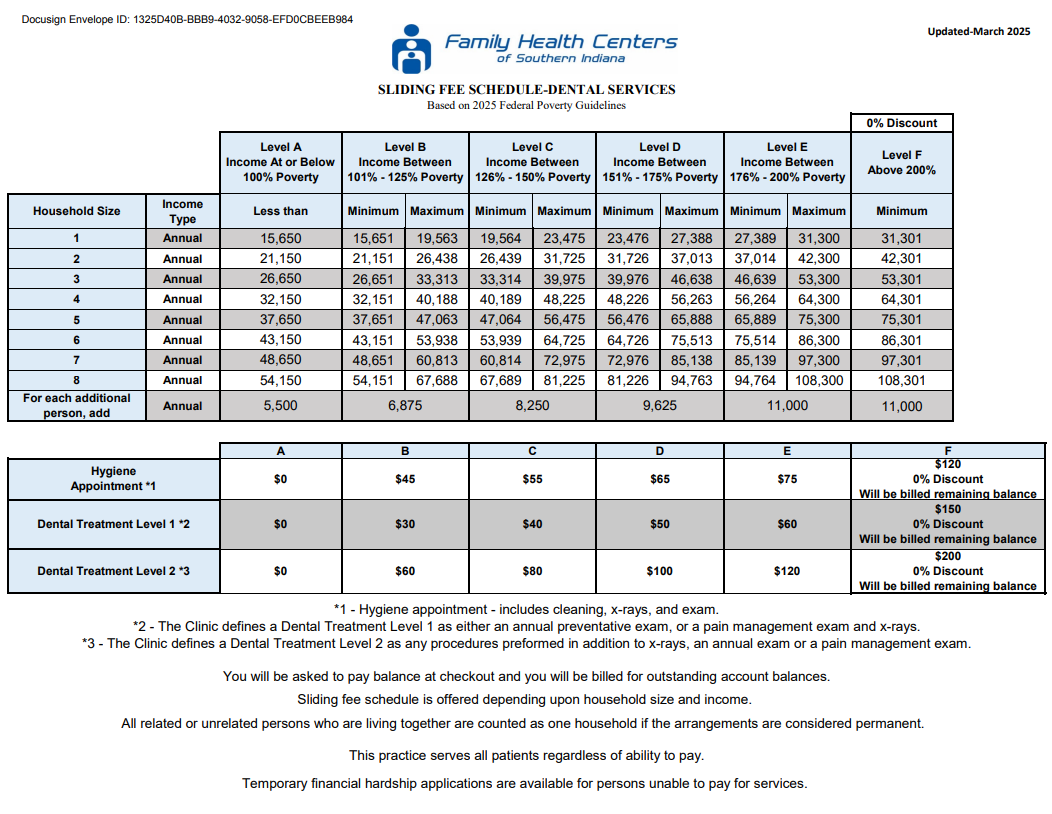 This changes each year according to the Federal Poverty Levels guidelines . Please verify that sliding fee scale is current when you make an appointment.